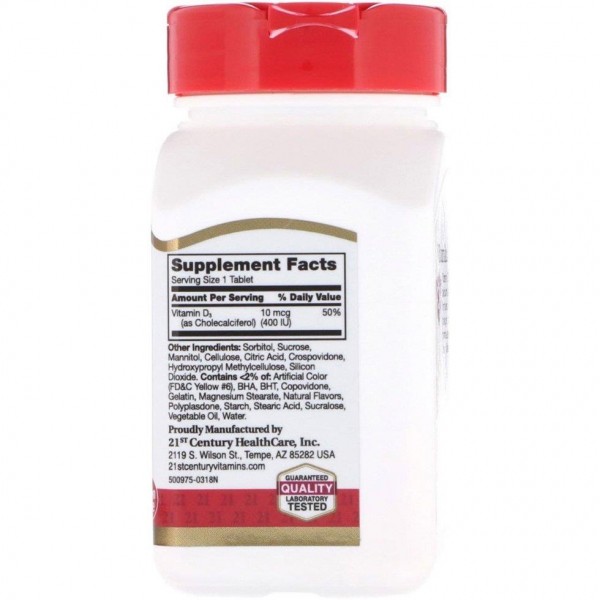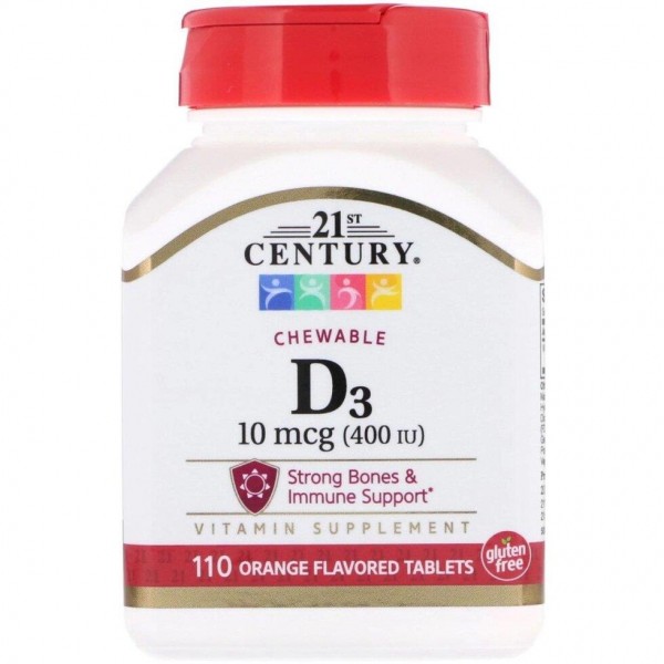 Зверніть увагу, що 21st Century Вітамін Д3 Vitamin D3 Chewable 400 IU 110tablets (Orange) не є лікарським засобом. Не замінює повноцінного харчування. Не перевищуйте рекомендовану добову дозу. Використовуйте згідно з інструкцією виробника, яка є на упаковці або всередині неї.