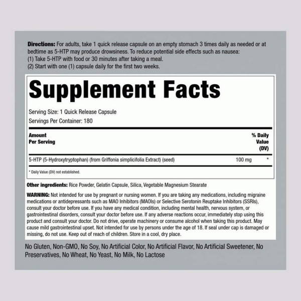Зверніть увагу, що 5-HTP 100 mg 180 Capsules не є лікарським засобом. Не замінює повноцінного харчування. Не перевищуйте рекомендовану добову дозу. Використовуйте згідно з інструкцією виробника, яка є на упаковці або всередині неї.