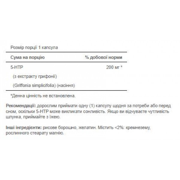 Зверніть увагу, що 5-гідрокситриптофан, 5-HTP 200mg - 60caps не є лікарським засобом. Не замінює повноцінного харчування. Не перевищуйте рекомендовану добову дозу. Використовуйте згідно з інструкцією виробника, яка є на упаковці або всередині неї.