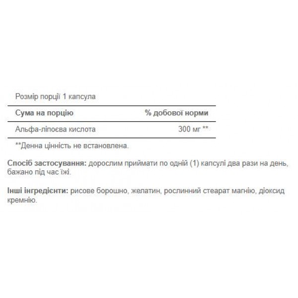 - Містить 300 мг альфа-ліпоєвої кислоти на софтгель.