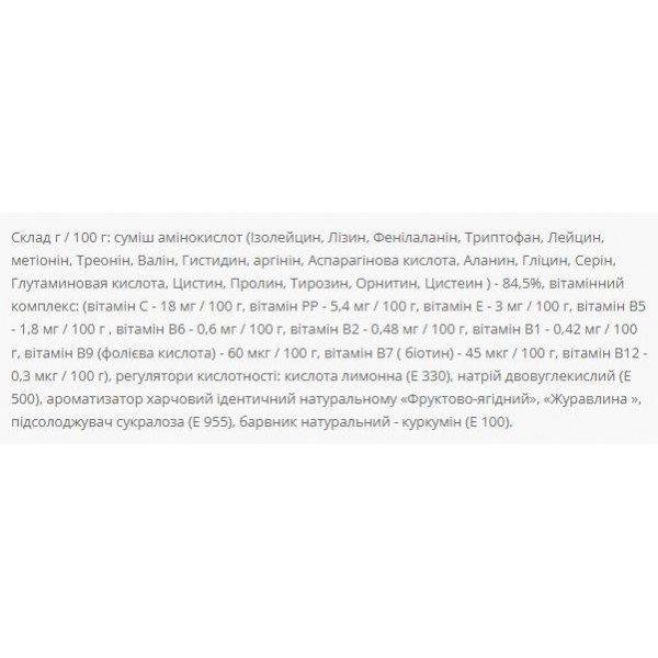Зверніть увагу, що Комплекс амінокислот, Amino Complex System - 500g Cranberry не є лікарським засобом. Не замінює повноцінного харчування. Не перевищуйте рекомендовану добову дозу. Використовуйте згідно з інструкцією виробника, яка є на упаковці або всередині неї.
