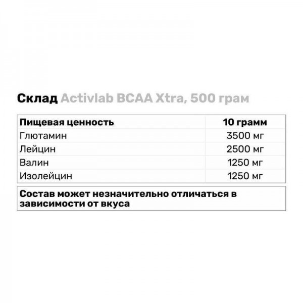 Основа добавки-L-лейцин, L-ізолейцин і L-валін в пропорції 2:1:1. Додатково в складі присутній глютамін. Особлива технологія виробництва дозволяє добавці добре розчинятися у воді.