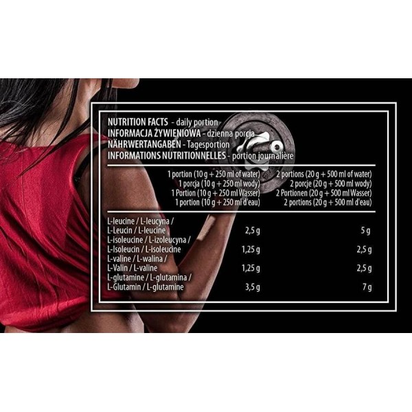 Основа добавки-L-лейцин, L-ізолейцин і L-валін в пропорції 2:1:1. Додатково в складі присутній глютамін. Особлива технологія виробництва дозволяє добавці добре розчинятися у воді.