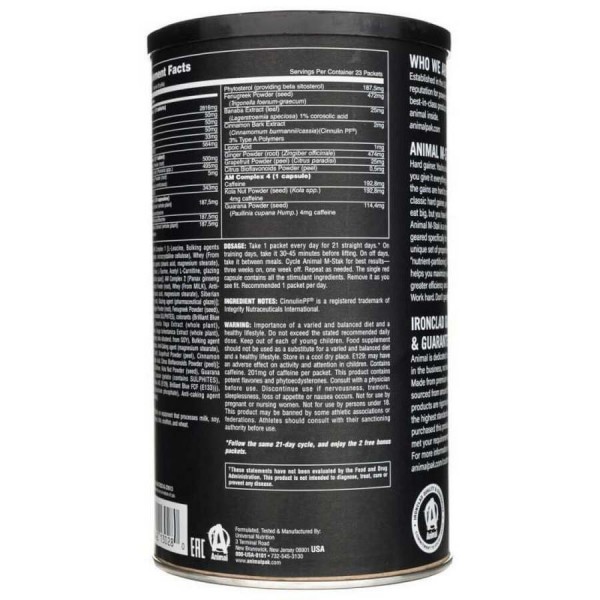 Animal M–Stak є найпотужнішим стимулятором комплексного протеїнового синтезу. При цьому ідеально збалансована формула містить блокатори, які не дозволять тестостерону перетворитися в DHT або естрогени. Підвищуючи природний синтез найважливіших гормонів, ви з легкістю не лише відновите нарощування нових м'язів, але і збільшите їх об'єм і силу. Стимуляція вироблення гормону росту і тестостерону дасть відчутне підвищення показників сили і витривалості, які безумовно зададуть абсолютно новий темп вашим досягненням. Дана харчова добавка заслужено є однією з найефективніших в даній категорії спортивного харчування. Додавши її до свого раціону, ваші тренування стануть справжнім конвеєром результативності.