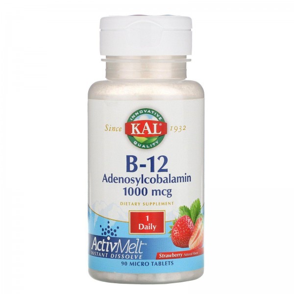 Обговорення: мікротаблеткі KAL B-12 аденозилкобаламін ActivMelt, наповнені натуральним полуничним смаком, швидко тануть у роті і призначені для поліпшеного засвоєння організмом. Аденозилкобаламін - біологічно активна форма вітаміну B-12, він є основною формою в мітохондріальних клітинних тканинах. Вегетаріанський продукт.