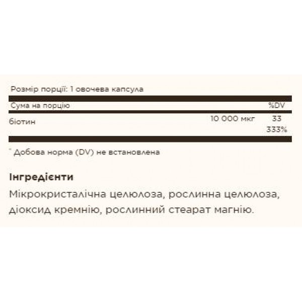 Зверніть увагу, що Біотин, Biotin 10000 mcg - 60 vcaps не є лікарським засобом. Не замінює повноцінного харчування. Не перевищуйте рекомендовану добову дозу. Використовуйте згідно з інструкцією виробника, яка є на упаковці або всередині неї.