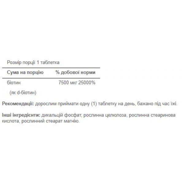 Зверніть увагу, що Biotin 7500 mcg - 100 tab не є лікарським засобом. Не замінює повноцінного харчування. Не перевищуйте рекомендовану добову дозу. Використовуйте згідно з інструкцією виробника, яка є на упаковці або всередині неї.