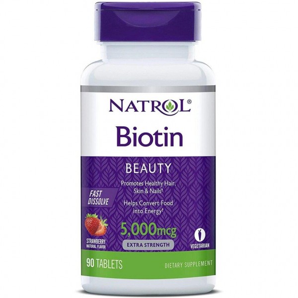 Natrol Biotin Fast Dissolve відомий тим, що підтримує здорове зростання волосся, сяючу шкіру і сильніші нігті. Він має полуничний смак і його можна приймати у будь-який час та в будь-якому місці. Вода не потрібна. Він швидкодіючий та ідеально підходить для тих, кому важко ковтати вітаміни та добавки.