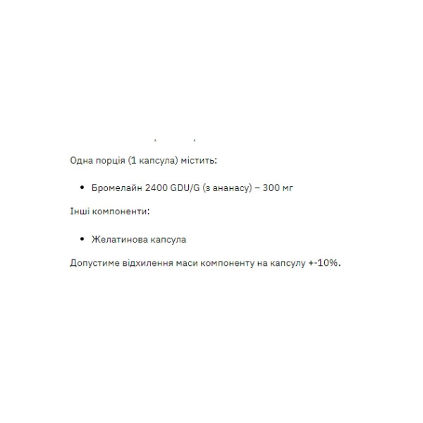 Харчова добавка містить бромелайн – є комплексом ферментів, що отримується зі стебла ананасу. Бромелайн допомагає травній системі ефективніше розщеплювати їжу. Дія бромелайну полягає переважно у стимулюванні утворення плазміну – компоненту, який блокує формування протизапальних сполук і розщеплює фібрин —речовину, що спричиняє набряки, запалення та утворення шрамів. Бромелайн може бути корисним як засіб для покращення травлення, його використовують переважно для відновлення після травм, розтягнення зв'язок, артриту, хірургічних операцій та інших фізичних травм. Бромелайн також сприяє відновленню організму після запалення. Численні клінічні дослідження підтверджують здатність бромелайну зменшувати набряки, синці, біль після хірургічних операцій та скорочувати період загоєння. Також бромелайн сприяє підтримці суглобів і захищає здоров'я хрящів, зменшуючи окиснювальний стрес і генетичні прояви сполук, що є тригерами запалення та болю. Ряд клінічних досліджень з бромелайном та іншими протеолітичними ферментами свідчать про їхню здатність поліпшувати функції та рухливість суглобів, а також зменшувати дискомфорт. Дія добавки: Поліпшення травлення Полегшення запальних процесів у разі травм Прискорення відновлення після травм та інших пошкоджень Відновлення м'язів після тренування Зниження згортання крові Спосіб застосування: Дорослим по 1 порції (1 капсула) 1-2 рази на день, під час або після прийому їжі.