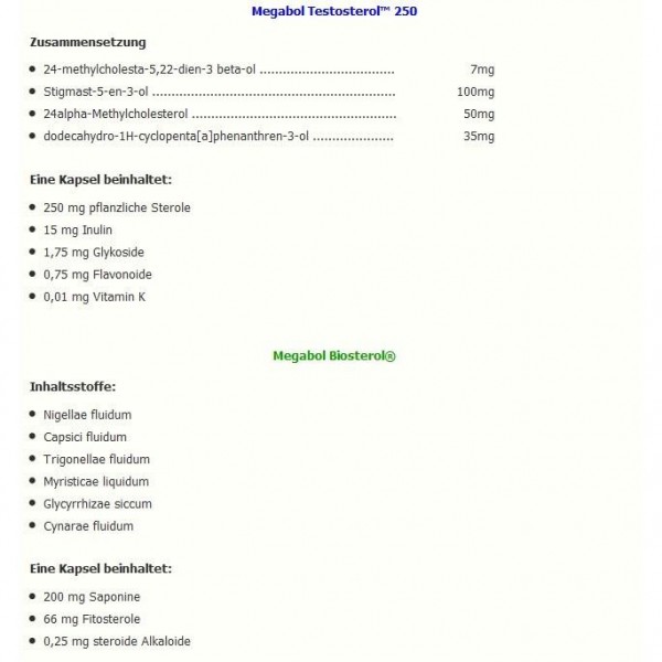 Testosterol 250 Megabol – це високоефективний анаболічний стимулятор. Безпечний аналог синтетичних стероїдів, що пройшов численні клінічні тестування та апробації. На відміну від своїх «нелегальних» попередників, продукт містить так звані прогормони — біологічно активні речовини рослинного походження, які не мають нічого спільного зі штучним тестостероном. Діють такі стерини м'яко, не викликаючи хворобливого звикання з боку центральної нервової системи. Як результат – підвищення рівня тестостерону досягається за рахунок оптимізації роботи статевих залоз, а не шляхом заміщення власних гормонів синтетичними.