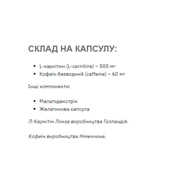 L-Карнітин (L-Carnitine) - це амінокислота, природна речовина, споріднена з вітамінами групи В, є жиросжигателем. Спалювання жиру здійснює транспорт жирних кислот у мітохондріальний матрикс, де відбувається їхнє руйнування з виділенням енергії саме під час фізичних навантажень. Кофеїн (Caffeine) здатний збільшувати силу, стимулюючи викид норадреналіну з адреналінових залоз та сприяючи кращому скороченню м'язів. Кількість кофеїну, необхідне поліпшення спортивних результатів, — приблизно 200 мг. Є термогенним стимулятором центральної нервової системи. РЕКОМЕНДАЦІЇ ЩОДО ЗАСТОСУВАННЯ: Порція дорівнює 2-м капсул. Рекомендується приймати одну порцію на кожні 60 кг маси тіла протягом години до тренування. Максимальна разова порція, що має найбільший корисний відгук результативності, становить 2000 мг L-карнітину. Подальше збільшення разової порції немає сенсу. Вживання L-карнітину разом із кофеїном має синергетичний характер, ефект буде посилено (але й навантаження на серцево-судинну та ЦНС збільшиться). Не приймайте цей препарат натще; не перевищуйте рекомендоване дозування!