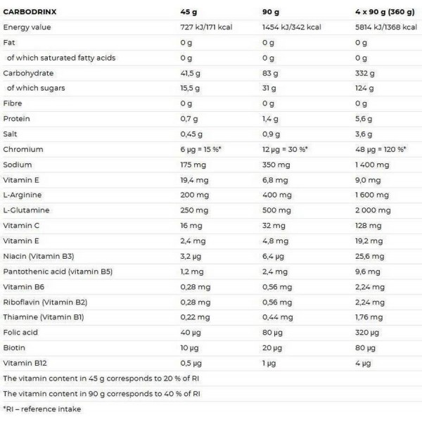 Він містить різноманітні джерела вуглеводів як швидкого використання, так поступового вивільнення енергії. 5 джерел вуглеводів (мальтодекстрин, фруктоза, сахароза, глюкоза, ізомальтулоза) дадуть вам енергію і допоможуть відновитися після інтенсивних фізичних вправ. Вітаміни групи В допоможуть зменшити відчуття втоми та втоми та водночас підтримувати оптимальний енергетичний обмін. Carbodrinx також унікальний для спортсменів завдяки доданим антиоксидантам, вітамінам C, E та амінокислотам L-аргініну та L-глютаміну.