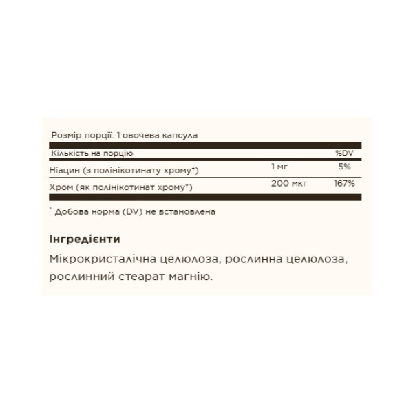 Зверніть увагу, що Chromium Polynicotinate 200mcg YeastFree - 100 vcaps не є лікарським засобом. Не замінює повноцінного харчування. Не перевищуйте рекомендовану добову дозу. Використовуйте згідно з інструкцією виробника, яка є на упаковці або всередині неї.
