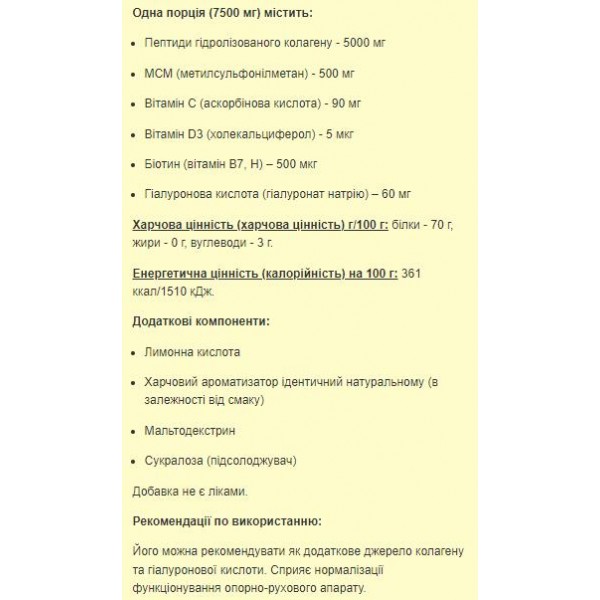 Харчова добавка Stark Pharm - Stark Collagen Peptides & Hyaluronic Acid - це комплекс, який містить колаген і гіалуронову кислоту в якості основи, доповнений рядом вітамінів. Склад добавки сприяє нормалізації роботи опорно-рухового апарату, є додатковим джерелом колагену та гіалуронової кислоти. Саме наявність додаткових компонентів, таких як вітаміни С і D3, біотин, МСМ (метилсульфонілметан), максимально посилюють дію основних компонентів добавки, і саме завдяки цьому наш організм отримує максимальну користь від використання комплексу. Колаген є основним структурним білком, який природним чином синтезується в організмі і складається в основному з трьох амінокислот: проліну, гліцину та гідроксипроліну. Колаген виконує багато важливих функцій, і завдяки йому тканини стають міцними, еластичними і легко розтягуються. Ефективно сприяє омолодженню шкіри, її пружності та збереженню пружності якомога довше. Цей білок підвищує зволоження шкіри з 21% до 50%. Крім того, він підвищує міцність нігтів, рухливість і гнучкість суглобів. Гіалуронова кислота забезпечує ефективну роботу суглобів. Крім того, він зволожує та омолоджує шкіру, відновлює пошкодження та додає здоровий блиск. МСМ (метилсульфонілметан) сприяє злагодженій і безперебійній роботі всього організму. Він має потужну протизапальну властивість, при цьому його ефективність максимально висока при лікуванні запальних процесів, що протікають в суглобах. Крім того, досліджуваний елемент бере участь у синтезі колагену і кератину, необхідних для підтримки еластичності і пружності шкіри, а також для активізації росту волосся і нігтів. Вітамін С (аскорбінова кислота) бере активну участь у створенні колагену і захисту від антиоксидантів. Вітамін D3 (холекальциферол) підтримує життєдіяльність організму, регулює важливі біохімічні процеси. Біотин (вітамін В7, Н) відноситься до водорозчинних вітамінів групи В. У нашому організмі біотин бере активну участь в жировому, білковому і вуглеводному обміні і є одним з елементів, необхідних для нормального росту і розвитку клітин організму.