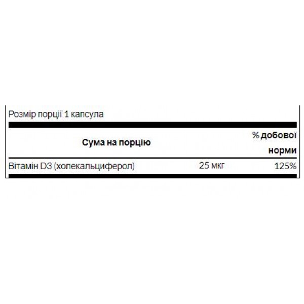 - Висока концентрація вітаміну D3: 1000 IU (25 мкг) на капсулу