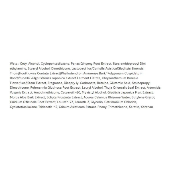 Екстракт женьшеню – активізує синтез колагену, прискорює мікроциркуляцію крові, завдяки чому благотворно впливає на волосяні цибулини та стимулює зростання нового волосся. Пантенол ефективний у лікуванні різних дерматологічних захворювань. Його дія спрямована на регенерацію шкірних покривів, зняття запалень, відновлення та глибоке живлення волосся.