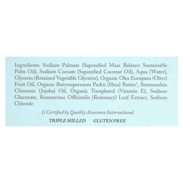 Пальмат натрію (омилена екологічно чиста пальмова олія), кокоат натрію (омилена кокосова олія), вода (Aqua), гліцерин (утримуваний рослинний гліцерин), органічна оливкова олія (Olea europaea)., органічне масло ши (Butyrospermum parkii)1, олія жожоба (Simmondsia chinensis), органічний токоферол (вітамін Е), глюконат натрію, екстракт листя розмарину (Rosmarinus officinalis), хлорид натрію.