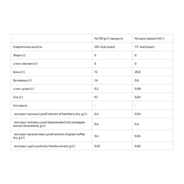 Склад: білки сироваткові (концентрат, ізолят та гідролізат сироваткового білку) – 72%, порошок сублімованих фруктів або ягід (ідентичні найменуванню смаку на упаковці) - 1,5%, регулятор кислотності – лимонна кислота (Е330), екстракт мучниці сухий - 0,1%, екстракт ананасу сухий (бромелайн) - 0,1%, екстракт зеленої кави сухий - 0,1%, екстракт худії сухий - 0,05%, ароматизатор харчовий, ідентичний натуральному (ідентичний найменуванню смаку на упаковці), підсолоджувач - сукралоза (Е955), барвник натуральний.