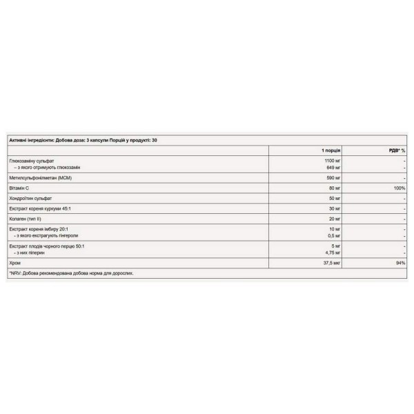 Капсули з дієтичною добавкою з глюкозаміном, МСМ, вітаміном С, хондроїтином, порошком гідролізованого курячого хряща, мінералами та рослинними екстрактами.