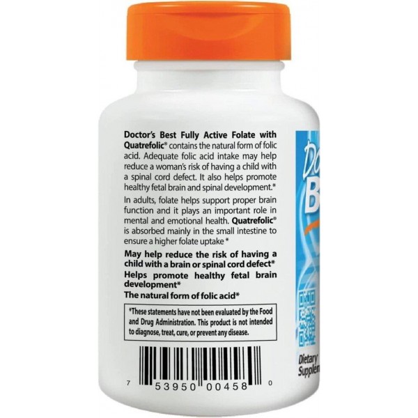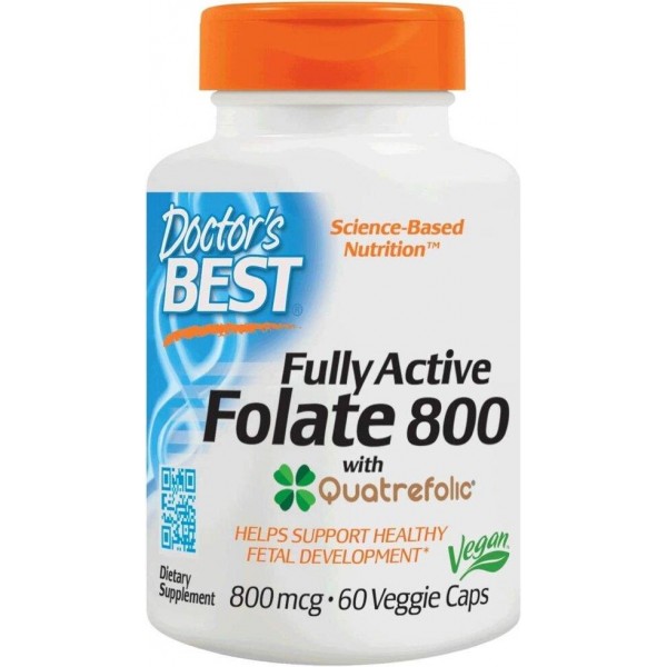 Повністю активний фолат від Doctor's Best з кватрефоліком містить кватрефолік, сіль глюкозаміну (695-метил-тетрагідрофолату, найбільш біодоступну форму фолієвої кислоти, яка забезпечує велику стабільність і розчинність у воді. Наш організм не може синтезувати фолієву кислоту,тому організм запасає фолієву кислоту в обмеженій кількості.Фолієва кислота та харчовий фолат повинні бути перетворені на метаболічно активну форму для використання організмом.Кватрефолік є метаболічно активним фолатом, що робить його більш ефективним, ніж фолієва кислота, для отримання максимальної користі!