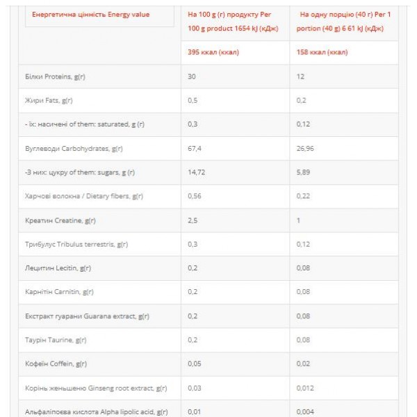 Спосіб застосування: Змішайте одну порцію (зазвичай 40 г) з 300 мл води або молока. Рекомендується вживати 1-3 рази на день, в залежності від ваших індивідуальних потреб та рівня фізичної активності. Найкраще споживати після тренування або між прийомами їжі для підтримки енергетичних запасів.