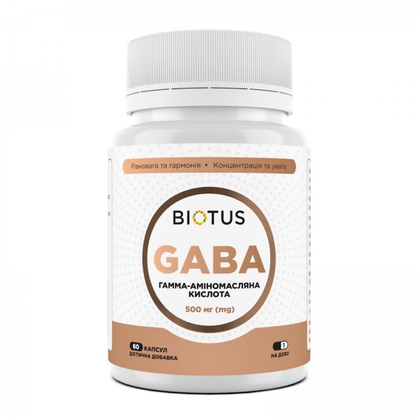 GABA, Biotus - це комбінація гамма-аміномасляної кислоти і вітаміну B6, розроблена для включення до раціону людей з високим рівнем активності або які прагнуть збалансованого стану. Гамма-аміномасляна кислота (GABA) - це нейромедіатор, який бере участь у процесах регуляції збудження та розслаблення в центральній нервовій системі. GABA відіграє важливу роль у передачі сигналів між клітинами мозку, діючи на їхню активність і стан.