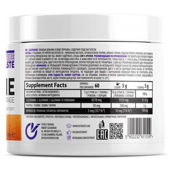 Зверніть увагу, що Глютамін L-glutamine 300 g Orange не є лікарським засобом. Не замінює повноцінного харчування. Не перевищуйте рекомендовану добову дозу. Використовуйте згідно з інструкцією виробника, яка є на упаковці або всередині неї.