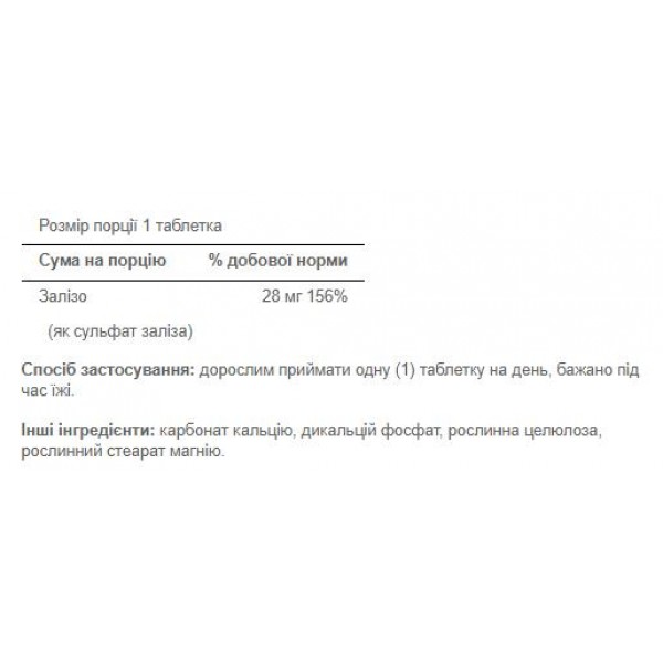 - Кожна таблетка містить 28 мг сульфату заліза.