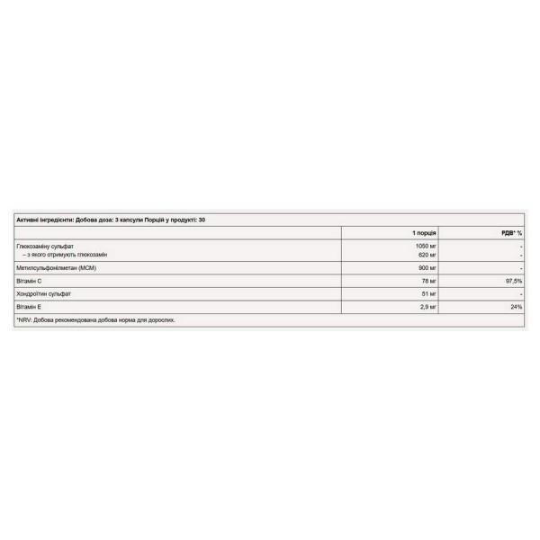 Склад: D-глюкозамін сульфат 2KCl, МСМ, харчовий желатин, хондроїтину сульфат, L-аскорбінова кислота, барвник (оксид заліза).