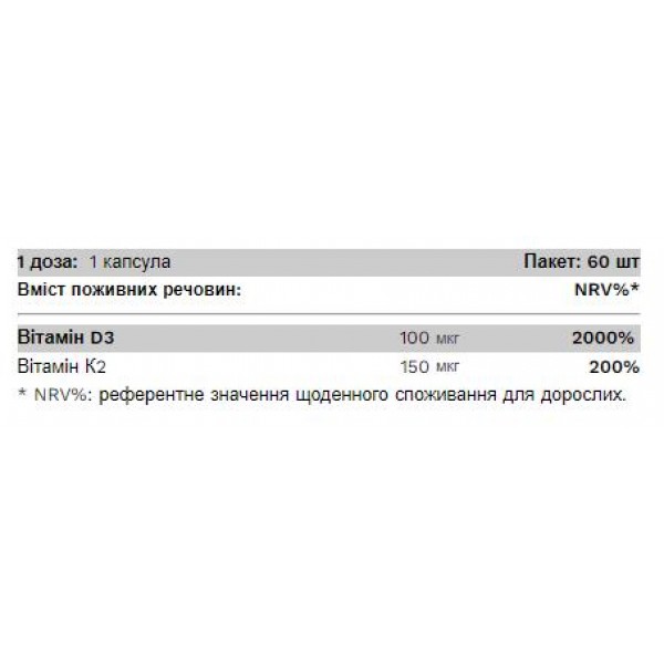Харчова добавка в капсулах, що містить комплекс вітамінів K2+D3. Вітамін D сприяє підтримці нормального рівня кальцію в крові, здоров'ю кісток і м'язів, нормальним зубам і нормальному функціонуванню імунної системи. * Вітамін К бере участь у підтримці нормальних кісток. * *Науково підтверджені твердження, схвалені Європейським агентством з безпеки харчових продуктів (EFSA). Рекомендоване дозування: приймати по 2 капсули в день під час їжі. Вага нетто: 46,14 г Інгредієнти: наповнювач (кукурудзяний крохмаль, мікрокристалічна целюлоза), харчовий желатин, барвник (оксид заліза), вітамін D (холекальциферол), вітамін K (менахінон) Попередження: Зберігати в недоступному для маленьких дітей місці! Продукт не замінює змішане харчування та здоровий спосіб життя! Не перевищуйте рекомендовану добову норму споживання! Інформація про алергени: виготовлено на заводі, який переробляє молоко, яйця, глютен, сою, арахіс, лісові горіхи, рибу та інгредієнти ракоподібних. Зберігає якість: до кінця місяця, зазначеного на упаковці (місяць/рік). Зберігання: Зберігати продукт у місці, захищеному від сонячного світла та інших теплових впливів, при температурі від 6 до 26 °C і при відносній вологості повітря 65%!