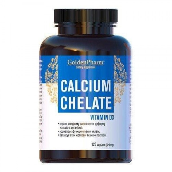 Кальцій хелат із вітаміном D від Голден Фарм — джерело біодоступної хелатної форми кальцію та вітаміну D3, яке сприяє швидкому заповненню дефіциту кальцію в організмі, нормалізації функціонування м'язів, нормальній передачі нервових імпульсів і підтримує нормальний стан кісткової тканини та зубів.