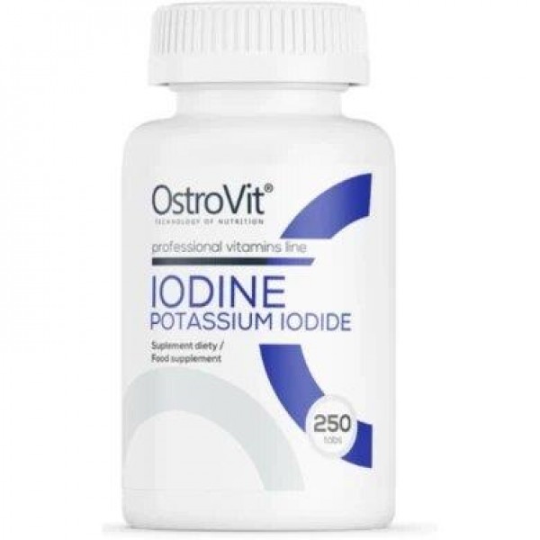 OstroVit IODINE Potassium Iodine - є харчовою добавкою в таблетках, що містить йод у формі йодиду калію. Йод є незамінним мікроелементом, який відіграє значну роль у нашому організмі, серед іншого, він допомагає у правильному виробленні гормонів щитовидної залози та у правильному функціонуванні щитовидної залози, сприяє підтримці правильного енергетичного обміну та допомагає у правильне функціонування нервової системи.
