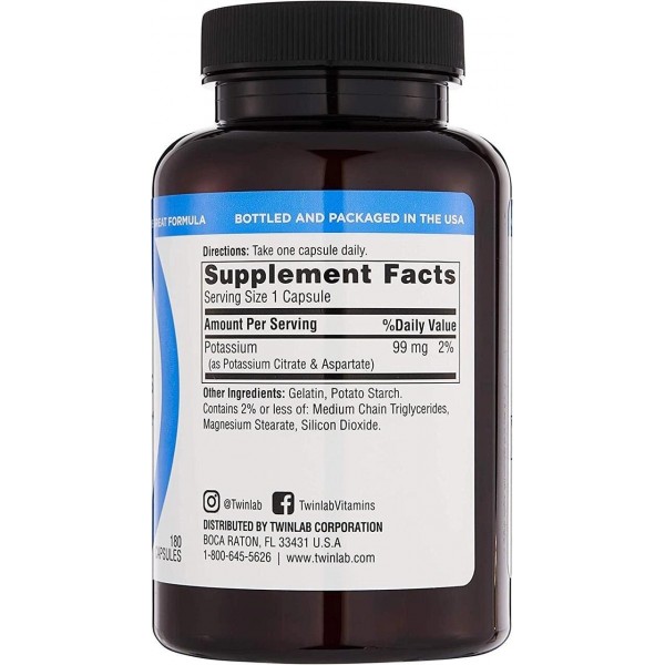 Відмінним джерелом калію виступає Potassium Caps від компанії Twinlab , у кожній капсулі якої міститься 99 мг калію у формі калію цитрату та калію аспартату. Дані форми мають найкраще засвоєння і полегшують всмоктування калію в кров.