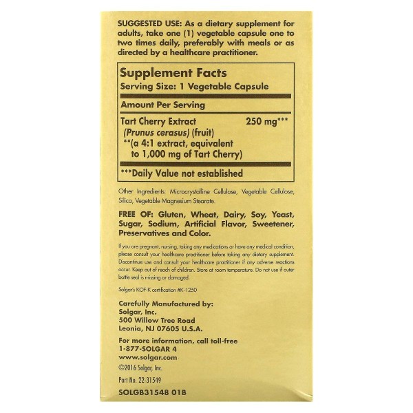 Вишню споживали як їжу та ліки протягом тисячоліть. Як один із основних їстівних видів вишні, терпкий смак вишні є відмінною рисою смачних печених страв, таких як вишневий пиріг. Формула Solgar ® Tart Cherry забезпечує здоров’я природні властивості вишні без усіх калорій і цукру.Терпка вишня (Prunus cerasus) природним чином містить поліфенольні антиоксидантні сполуки, такі як кверцетин, хлорогенова кислота та антоціани, які можуть допомогти боротися з вільними радикалами, які викликають окисне пошкодження клітин нашого тіла. Нові наукові дослідження свідчать про те, що багата антиоксидантами вишня, включно з терпкою вишнею, може володіти різноманітними корисними властивостями. Ця формула забезпечує еквівалент 1000 мг (1 г) терпкої вишні в кожній овочевій капсулі, отриманої з високоякісного екстракту 4:1.