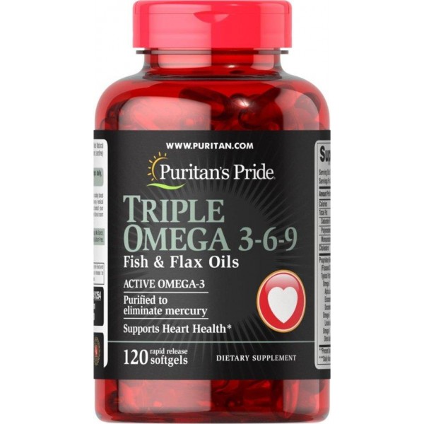 Puritan's Pride Triple Omega 3-6-9 Fish, Flax & Borage Oils – олії риби, льону та бурачника – це комбінований продукт 3-в-1, розроблений для підтримки здоров'я серця, здорового кровообігу та здоров'я суглобів. Продукт також містить олію примули вечірньої як джерело GLA.