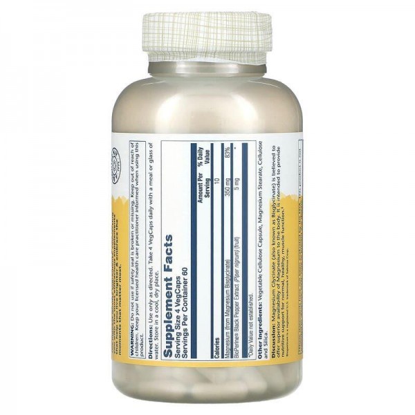 Вважається, що гліцинат магнію (також відомий як бісгліцинат) забезпечує вищу доступність магнію для організму. Він призначений забезпечити поживну підтримку здоров’я та нормального функціонування м’язів.