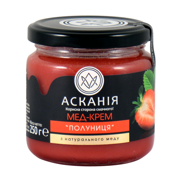Екологічно чистий мед-крем "Полуниця" із додаванням натуральної полуниці має насичений смак та приємний аромат. Він дуже корисний і поживний, може стати чудовим доповненням до здорового сніданку. Завдяки технології виробництва, крем-мед дуже зручний у використанні: не розтікається і не цукрується. В такій баночці меду зберігаються всі корисні властивості. Мед квітковий натуральний 96%, ягоди полуниці 1,5%, сік лимону концентрований, сік чорної моркви концентрований. Бiлкiв - 0.8 г; вуглеводiв - 73.6 г; 309 ккал.