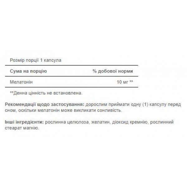Зверніть увагу, що Мелатонін, Melatonin 10mg - 60caps не є лікарським засобом. Не замінює повноцінного харчування. Не перевищуйте рекомендовану добову дозу. Використовуйте згідно з інструкцією виробника, яка є на упаковці або всередині неї.