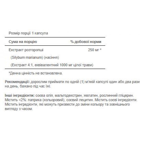 Зверніть увагу, що Екстракт Розторопші, Milk Thistle 4:1 Extract 1000mg - 180 softgels не є лікарським засобом. Не замінює повноцінного харчування. Не перевищуйте рекомендовану добову дозу. Використовуйте згідно з інструкцією виробника, яка є на упаковці або всередині неї.