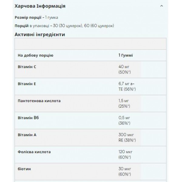 - Кількість: Упаковка містить 30 жувальних цукерок, що забезпечує місячний запас вітамінів.