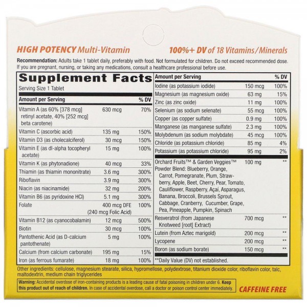 Карбонат кальцію, целюлоза, хлорид калію, оксид магнію, суміш фруктових / садових овочів (чорниця, апельсин, морква, гранат, слива, полуниця, яблуко, буряк, вишня, груша, помідор, цвітна капуста, малина, асаї, спаржа, банан, брокколі, брюссельська капуста, капуста, журавлина, огірок, виноград, горох, ананас, гарбуз, шпинат), аскорбінова кислота (вітамін С), dl-альфа-токоферілацетат (вітамін Е), фумарат заліза (залізо), ніацин (вітамін В3) стеарат магнію, оксид цинку, діоксид кремнію, модифікована целюлоза, пантотенат d-кальцію, полідекстроза, холекальциферол (вітамін D), молібдат натрію, піридоксин HCI (вітамін B6), сульфат марганцю, ацетат вітаміну A, рибофлавін (вітамін B2 / колір), тіамінмононітрат (вітамін В1), колір діоксиду титану, сульфат міді, йод калію, бета-каротин (вітамін А), ацтекскій екстракт календули ([квітка]), джерело лютеїну), селенат натрію, фітонадіон (вітамін К), тальк, ціанокобаламін ( вітамін) B12), мальтодекстрин, тригліцериди із середньою довжиною ланцюга (з oconut), екстракт Polygonum Cuspidatum (джерело кореня і кореневища), джерело ресвератрола), борат натрію, екстракт томата (джерело фруктів), фолієва кислота, біотин.