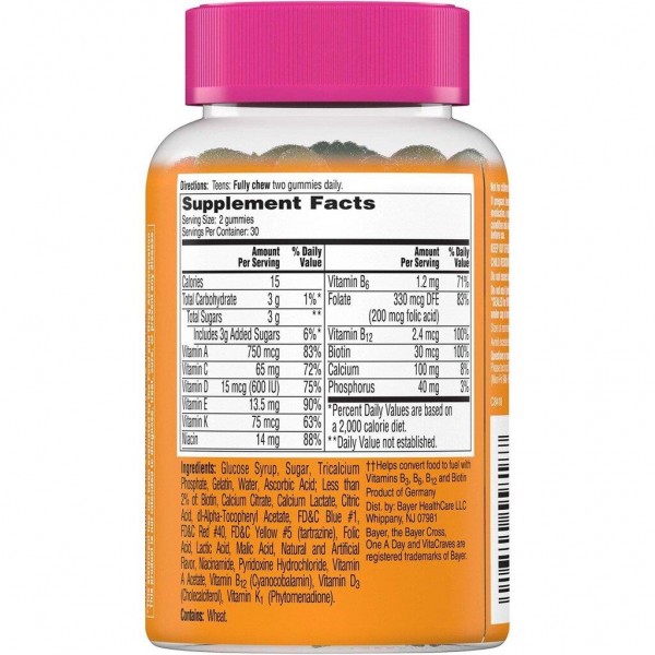 Підлітковий період, коли тіло змінюється у прискореному режимі, є серйозним випробуванням для організму. Особливо гостро це відчувають дівчата. One A Day For Her VitaCraves Teen Multivitamin Gummies був розроблений спеціально для того, щоб сприяти створенню міцного здоров'я майбутньої жінки. Мультивітамінний комплекс багатий на корисні елементи, яких потребує юний організм: вітаміни А, В6, В12, С, D, Е і К, ніацином, фолієву кислоту, біотин і кальцій. Вітамін А - це найважливіший мікроелемент для підліткового організму, його нестача може призвести до уповільнення росту та неправильного формування. Вітамін Е сприяє чистоті шкіри, росту густого і сильного волосся. Кальцій підтримує здоров'я кісткової системи, дарує красу та міцність нігтям. Вітамін D допомагає кальцію засвоюватися, бере участь у формуванні кісткової тканини. Завдяки вітамінам групи В їжа, що надходить в організм, краще переробляється на джерело енергії та сил. Біотин зберігає здорову шкіру, покращує поглинання вітаміну С, зменшує болі в м'язах при активному рості тіла.