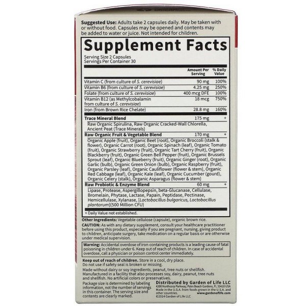 | RAW Organic Fruit & Vegetable Blend Organic apple (fruit), organic beet (root), organic broccoli (stalk & flower), organic carrot (root), organic spinach (leaf), organic tomato (fruit), organic strawberry (fruit), organic tart cherry (fruit) , organic blackberry (fruit), organic green bell pepper (fruit), organic brussels sprout (leaf), organic blueberry (fruit), organic ginger (root), organic garlic (bulb), organic green onion (bulb), organic raspberry ( fruit), organic parsley (leaf), organic cauliflower (flower & stem), organic red cabbage (leaf), organic kale (leaf), organic cucumber (gourd), organic celery (stalk), organic asparagus (flower & stem) | 170 mg | + |