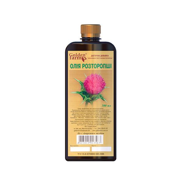 Масло розторопші плямистої - цінний харчовий і унікальний дієтичний продукт, а також ефективний засіб для профілактики багатьох захворювань. Найбагатший комплекс біологічно активних речовин: флавонідів, незамінних вищих жирних кислот (лінолева, ліноленова та ін.), каротиноїдів, вітамінів А, В, Е, К, Р, D, антиоксидантів. У маслі є особливий компонент - силібінін, який зміцнює і відновлює клітини печінки. Масло розторопші нейтралізує шкоду, що наноситься організму алкоголем, токсичними речовинами та вільними радикалами. Вона активізує обмінні процеси, «спалює» жир і підвищує імунітет організму.