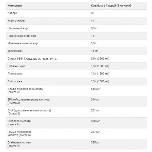 Ця формула містить суміш трьох олій преміум-класу – риби, льону та огуречника. Омега 3-6-9 містить незамінні жирні кислоти, необхідні для оптимального здоров’я та гарного самопочуття. Омега 3-6-9 також містить EPA та DHA омега-3 жирні кислоти, які підтримують здоров’я та функціонування різноманітних органів і систем. . включаючи серце, суглоби та шкіру. Молекулярна дистиляція використовується для видалення ртуті.