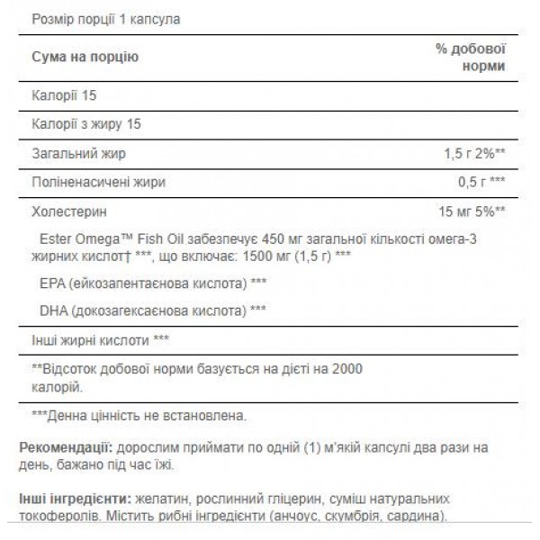 - Містить 1500 мг риб'ячого жиру на м'яку капсулу