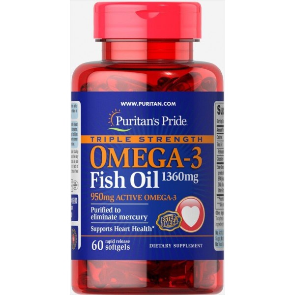 Puritan's Pride Triple Strength Omega-3 Fish Oil 1360 mg - це Ester-Omega® риб'ячий жир, який забезпечує 300 мг активних омега-3 поліненасичених жирних кислот, що складаються з ЕПК (EPA, ейкозапентаєнова кислота), ДГК (DHA, докозагексаєнова кислота) і інших жирних кислот.