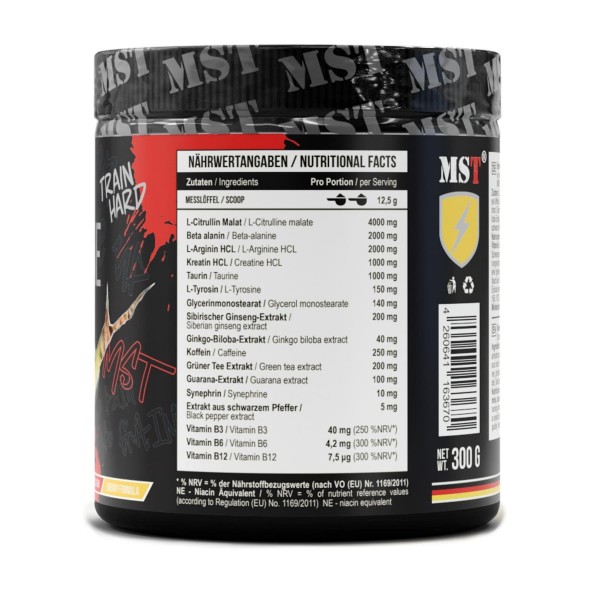 | L-цитрулін малат, бета-аланін, L-аргінін гідрохлорид, креатин гідрохлорид, таурин, інулін, ароматизатор, безводний кофеїн, екстракт сибірського женьшеню, екстракт зеленого чаю, антистежуючі агенти (трикальційфосфат, , оксид кремнію, підсолоджувач (сукралоза), барвник (бета-каротин), екстракт гінкго білоба, вітамін B3 (ніацинамід), синефрин (Citrus aurantium HCL), вітамін B6 (піридоксин гідрохлорид), екстракт чорного перцю, вітамін B12 (ціанок | |