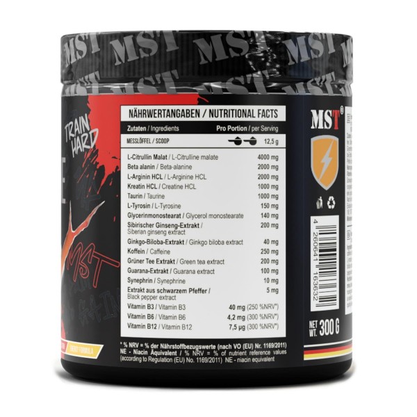 | L-цитрулін малат, бета-аланін, L-аргінін гідрохлорид, креатин гідрохлорид, таурин, інулін, ароматизатор, безводний кофеїн, екстракт сибірського женьшеню, екстракт зеленого чаю, антистежуючі агенти (трикальційфосфат, , оксид кремнію, підсолоджувач (сукралоза), барвник (бета-каротин), екстракт гінкго білоба, вітамін B3 (ніацинамід), синефрин (Citrus aurantium HCL), вітамін B6 (піридоксин гідрохлорид), екстракт чорного перцю, вітамін B12 (ціанок | |