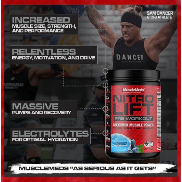 MuscleMeds Nitro Lift™ Pre-Workout - ефективний передтренувальний комплекс, який сприяє максимальній м'язовій силі, енергії, бадьорості та витривалості. та ніацином, які забезпечують насиченість м'язів АТФ та активують силу під час тренувань.Крім підвищення рівня АТФ та зміцнення м'язів, цей комплекс також стимулює центральну нервову систему та дофамінергічну систему завдяки кофеїну, ДМАЕ та макуні приенсу. Ця комбінація забезпечує надзвичайний рівень концентрації та інтенсивності, а також зменшує почуття втоми, даруючи невтомну енергію, мотивацію та драйв під час тренувань.Наступним компонентом NITRO LIFT клінічно протестована комбінація цитруліну та аргініну 1:1, яка, як показали результати, підвищує рівень оксиду азоту для покращення кровотоку та накачування м'язів. Крім того, доданий екстракт виноградних кісточок для зменшення вільних радикалів, підвищення рівня оксиду азоту та покращення відновлення м'язів.Цей продукт містить калій, натрій та магній та інші мікроелементи для покращення гідратації та максимальної продуктивності під час тренувань.